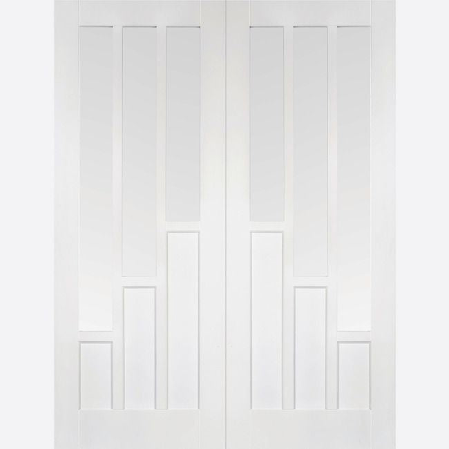 Shop now for your brand new LPD Internal White Primed Coventry Glazed Pair Of French Doors, A modern design featuring two white Coventry glazed doors creating a pair. Each door has three solid and three clear glazed panels to allow light to pass between rooms.